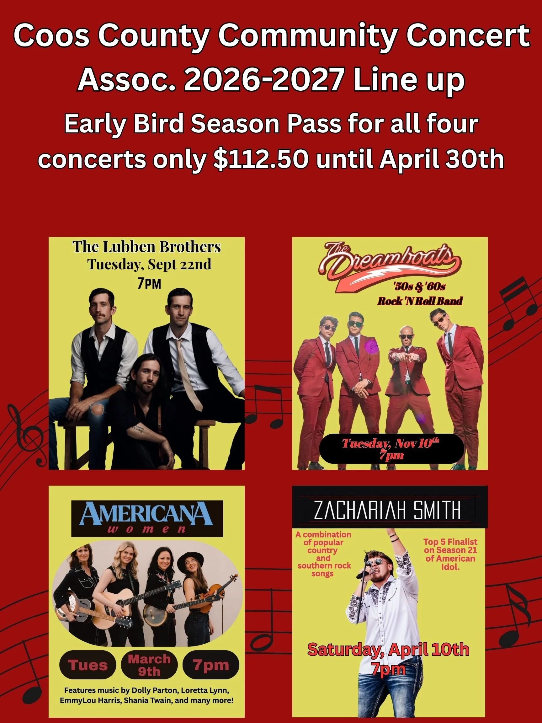 A 26/27 Season Pass is available for $125.00 and includes 4 concerts: